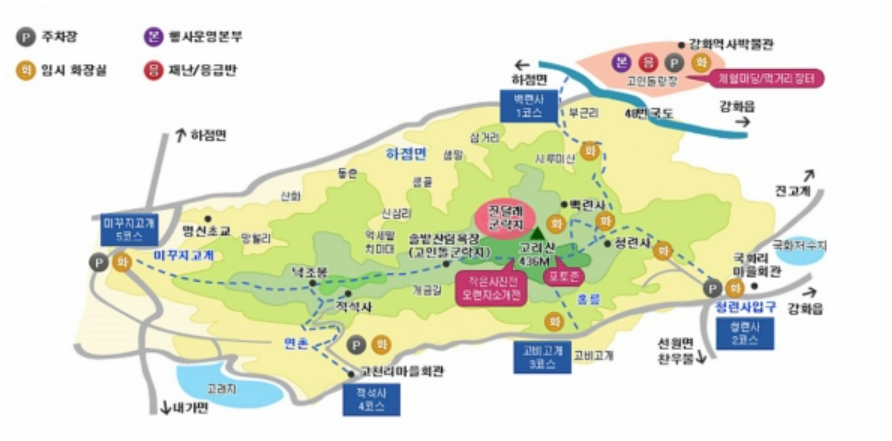 고려산에서 가장 큰 스트레스는 바로 주차입니다. 특히 시즌에는 차량 통제가 이루어지기 때문에 사전 정보가 필수입니다.
