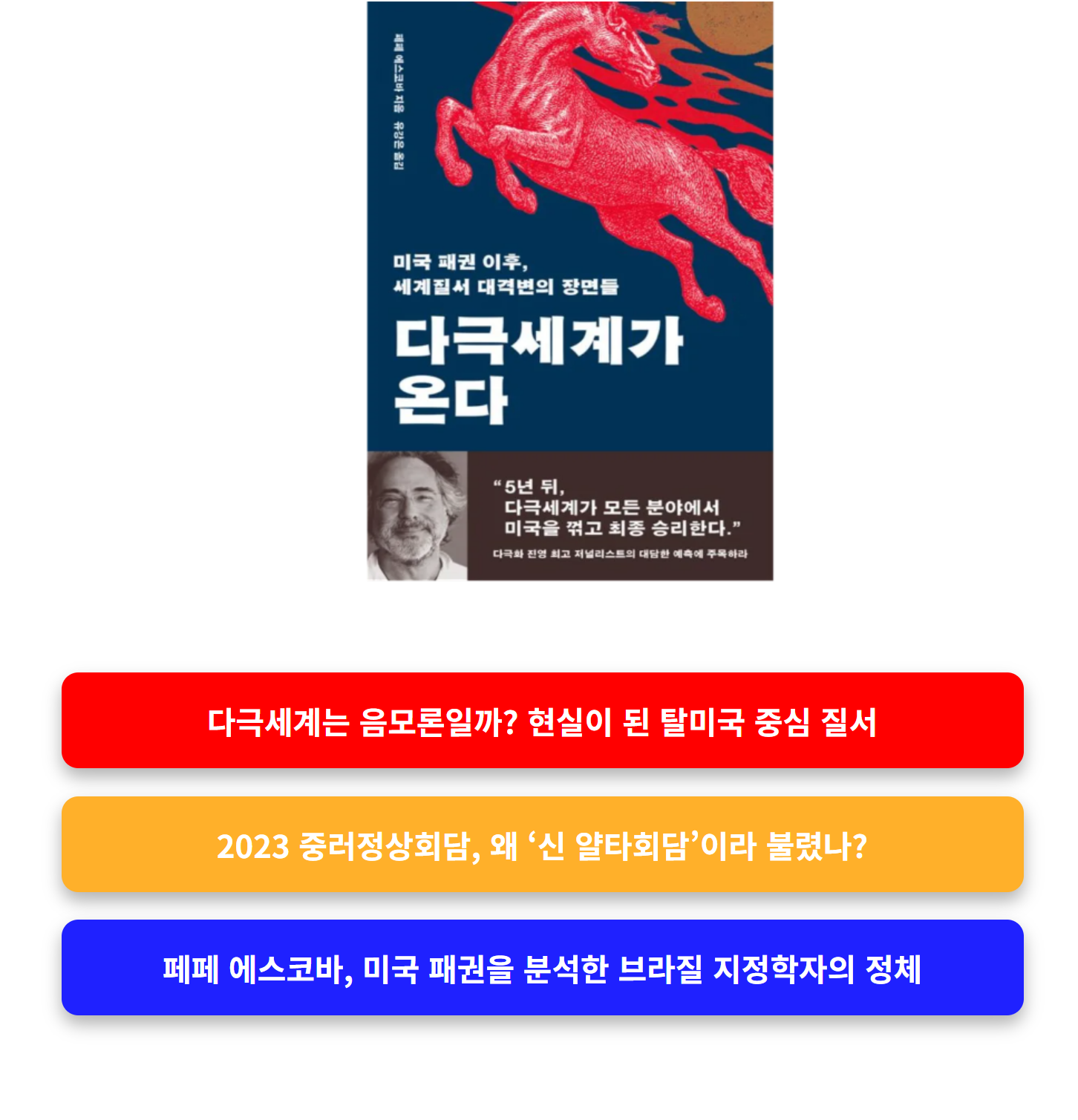 특히, 2023년 중러 정상회담을 ‘신 얄타회담’이라 정의하며 이 날을 기점으로 세계는 공식적으로 양극화에서 다극화로 이행했다고 설명합니다.