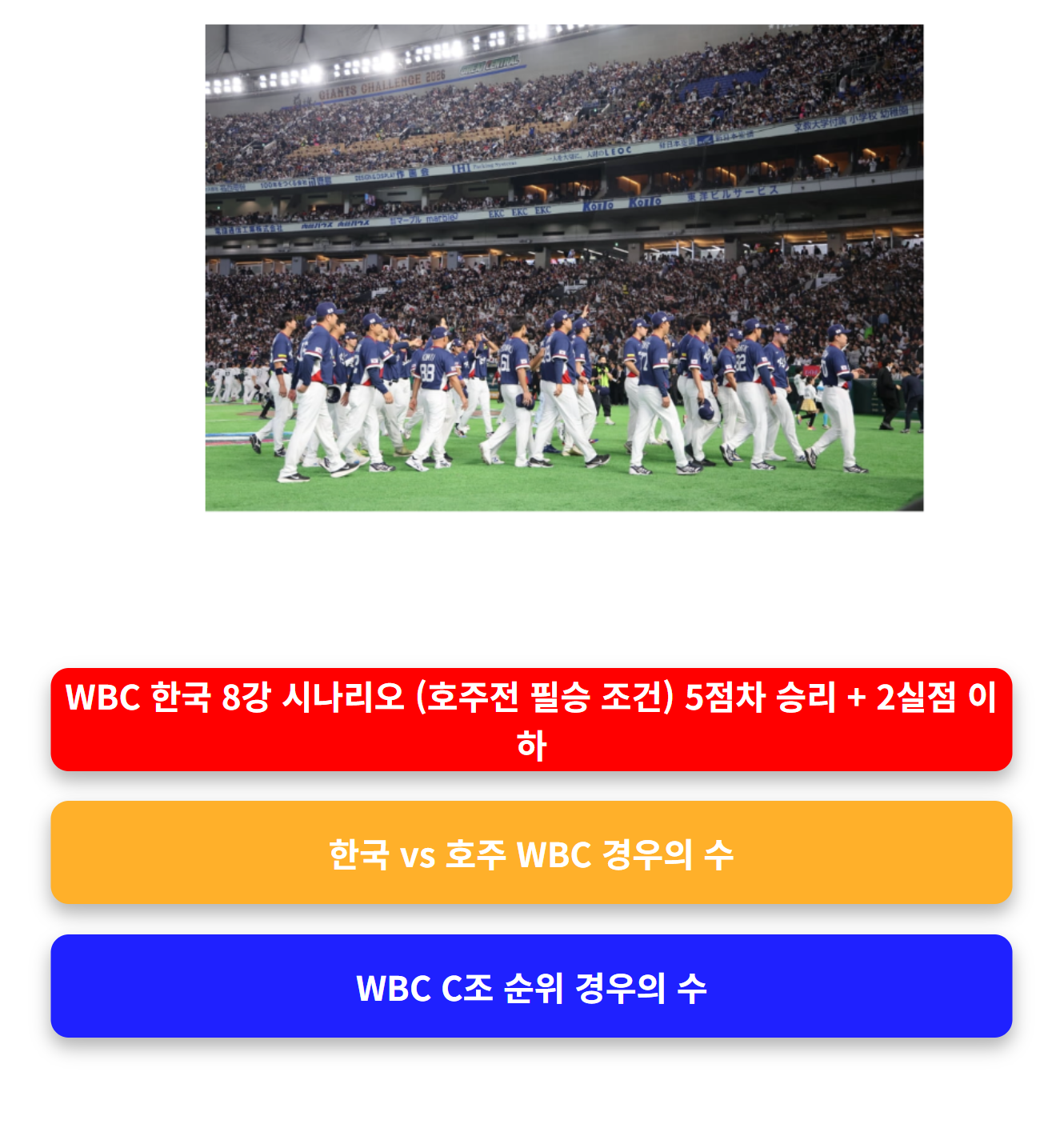이번 글에서는 대한민국 8강 경우의 수, WBC C조 순위 상황, 그리고 한국 vs 호주 경기 결과에 따른 시나리오를 자세히 정리해보겠습니다.