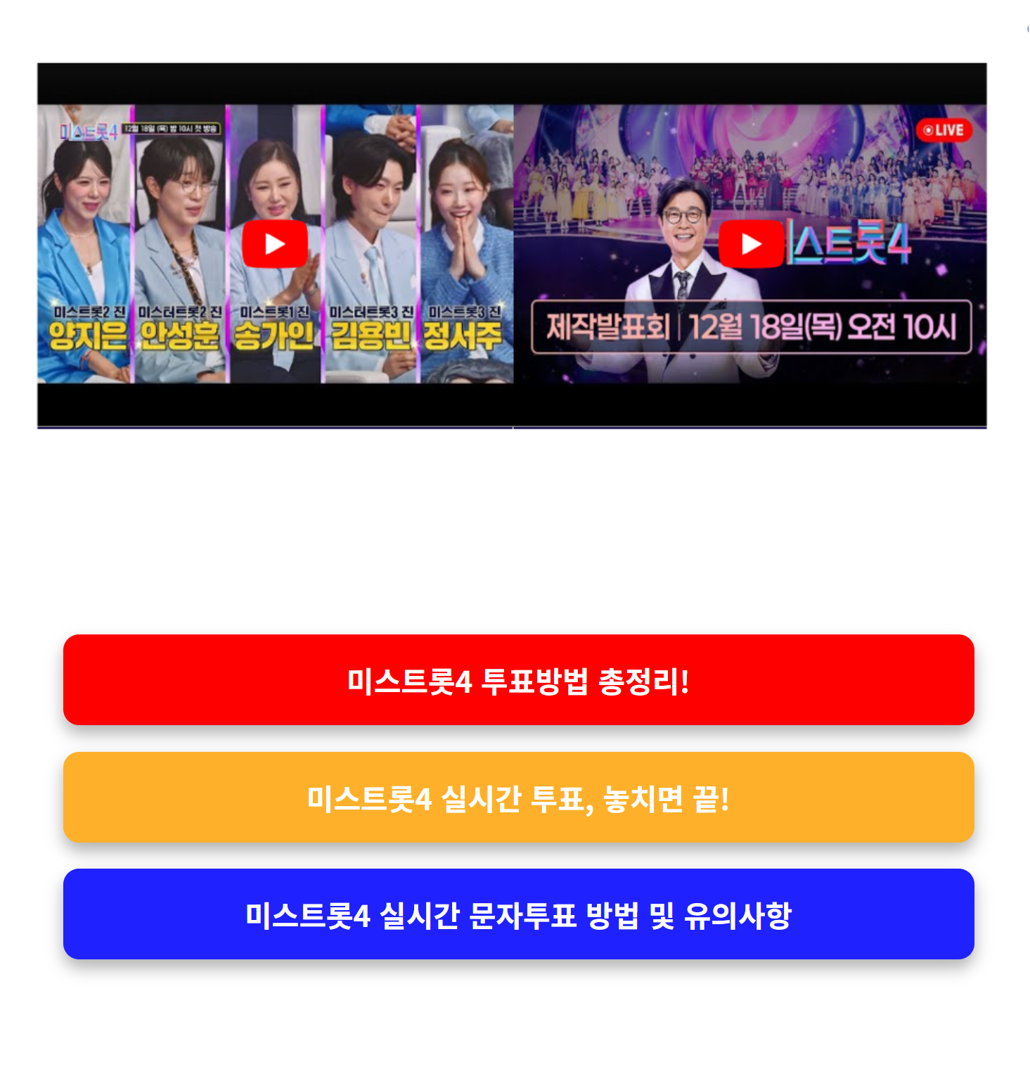 당신의 한 표가 새로운 트롯 여제를 만듭니다. 그런데... 투표 방법이 너무 복잡하다고요? 걱정 마세요! 지금 알려드리는 미스트롯4 투표방법만 따라오시면 단 1분 안에 투표 끝! 놓치면 후회할 꿀팁까지 모두 담았습니다.