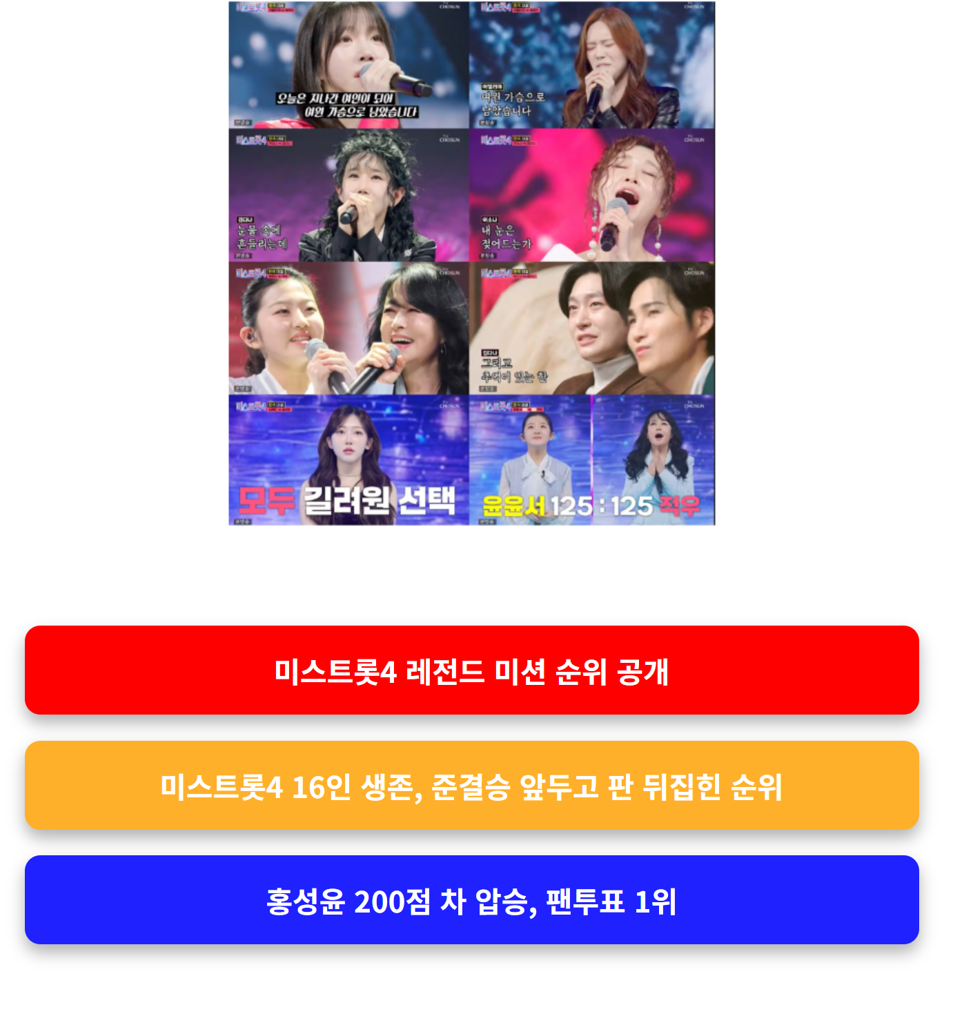 미스트롯4 16인 생존, 준결승 앞두고 판 뒤집힌 순위…홍성윤 중심 이동