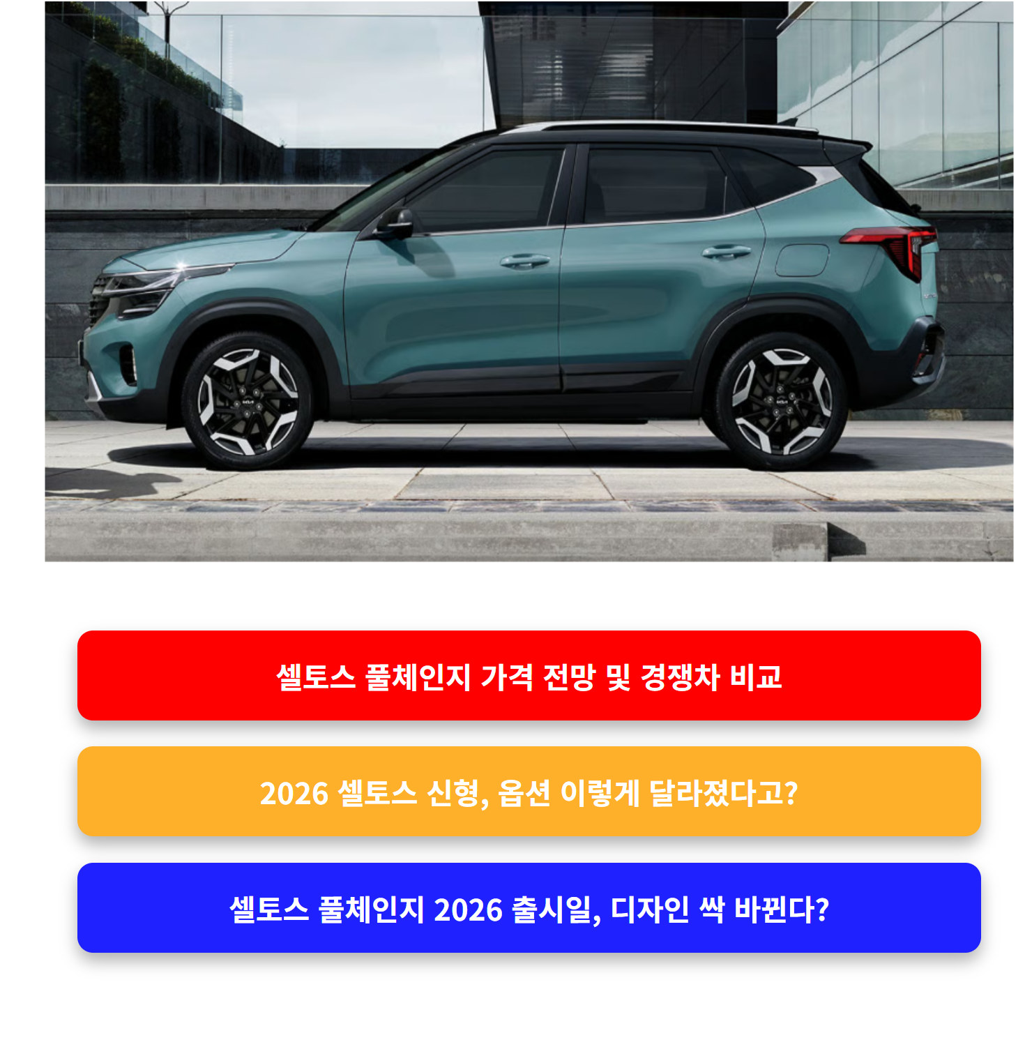 2026 셀토스 풀체인지는 디자인과 옵션만큼이나 가격에서도 새로운 기준을 만들 것입니다. 경쟁 모델 대비 합리적인 포지션, 하이브리드 라인업 추가, 높은 상품성은 분명한 강점이죠.