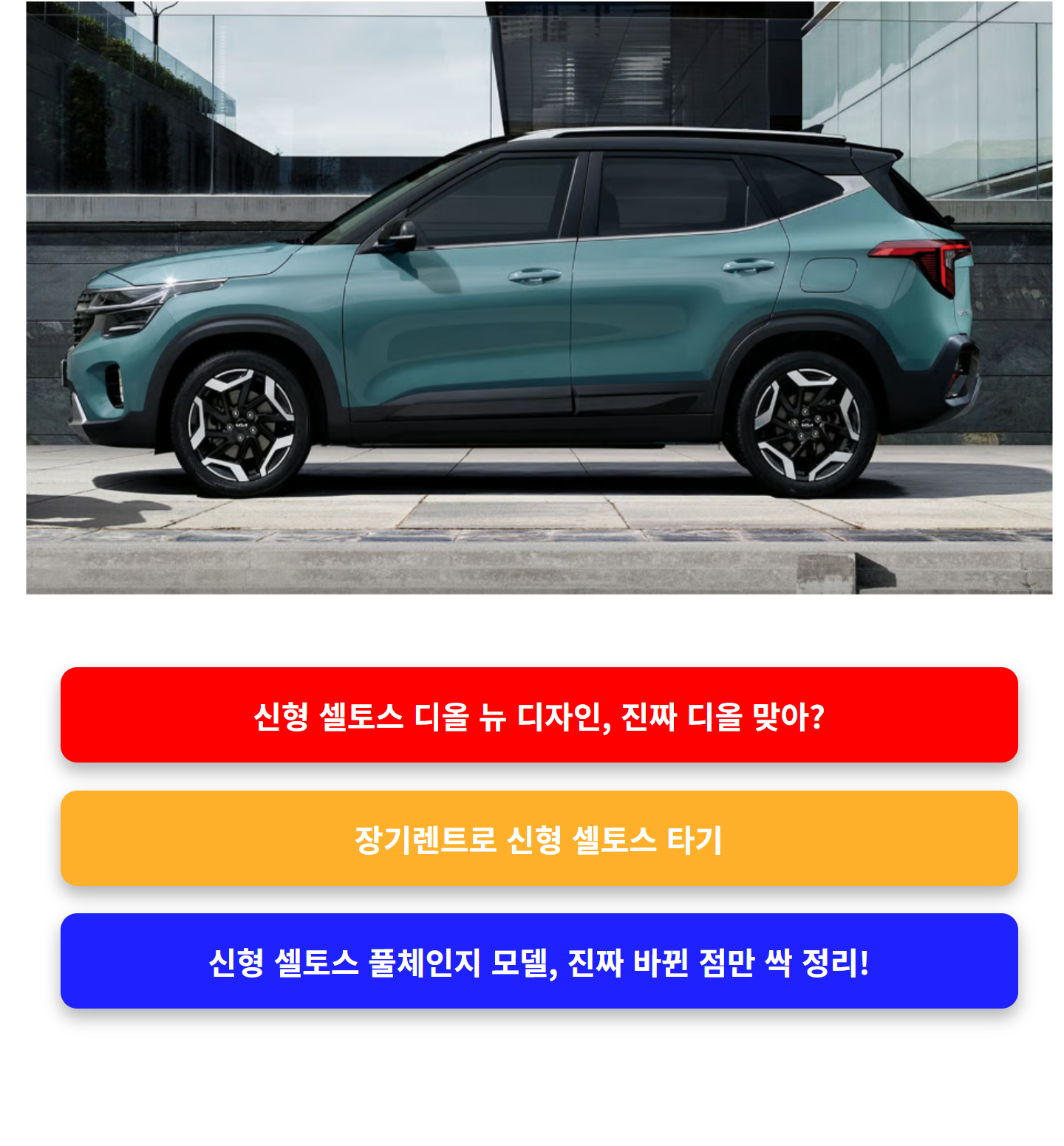 만약 급하게 차량이 필요한 상황이라면, **기존 셀토스 재고차 구매도 하나의 방법**입니다. 2025년 하반기로 갈수록 기아는 재고소진을 위한 **프로모션 확대** 가능성이 큽니다.