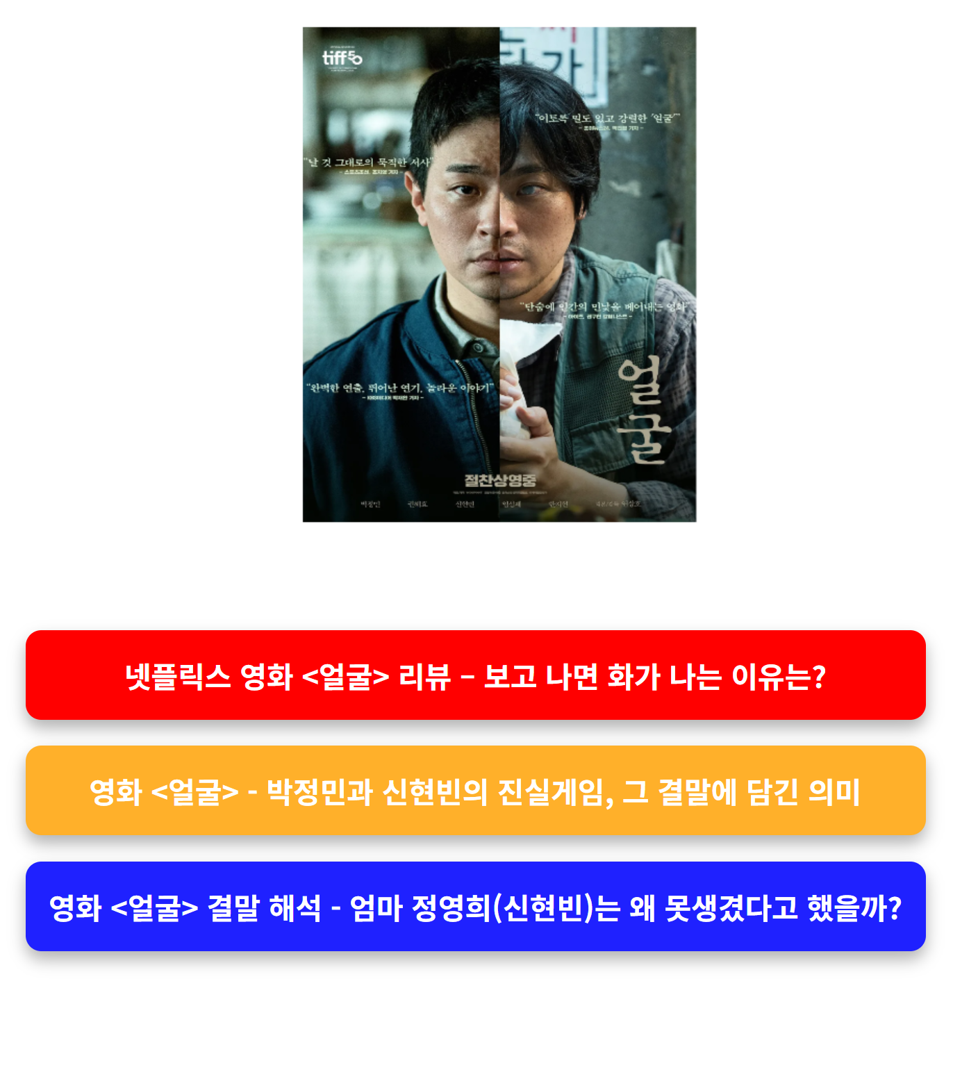 영화 <얼굴>은 단순한 범죄 미스터리가 아닙니다. 이 작품은 ‘가족이란 이름으로 우리가 얼마나 많은 진실을 왜곡하며 살아가는가’를 묻는 영화입니다. 그리고 그 질문은 관객 스스로에게 돌아옵니다. 나의 진실은 무엇이며, 나는 그것을 말할 용기가 있는가? 어머니의 진실, 아들의 거짓, 그 틈에서 우리는 수많은 얼굴을 마주하게 됩니다. 그 얼굴 중 진짜는 단 하나뿐입니다.