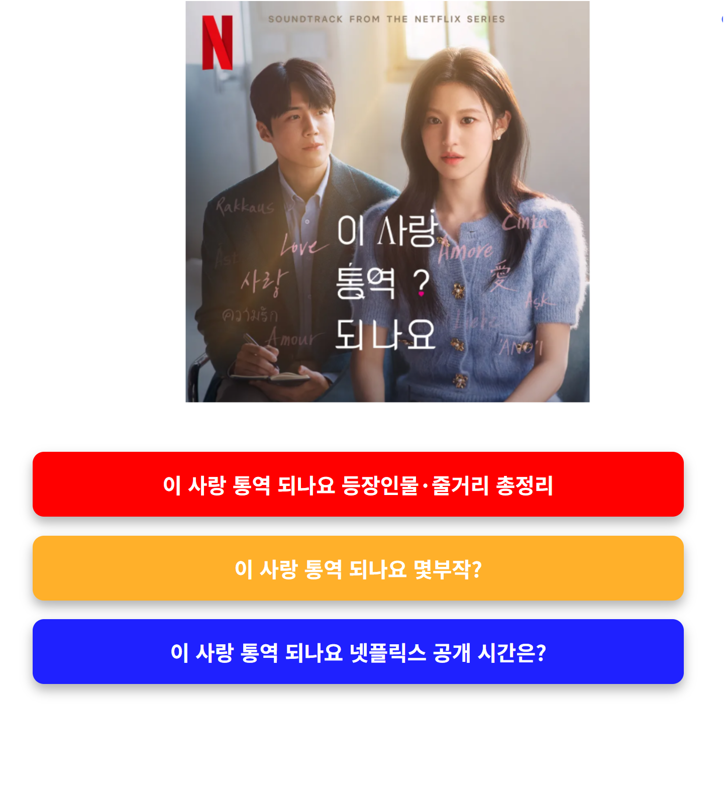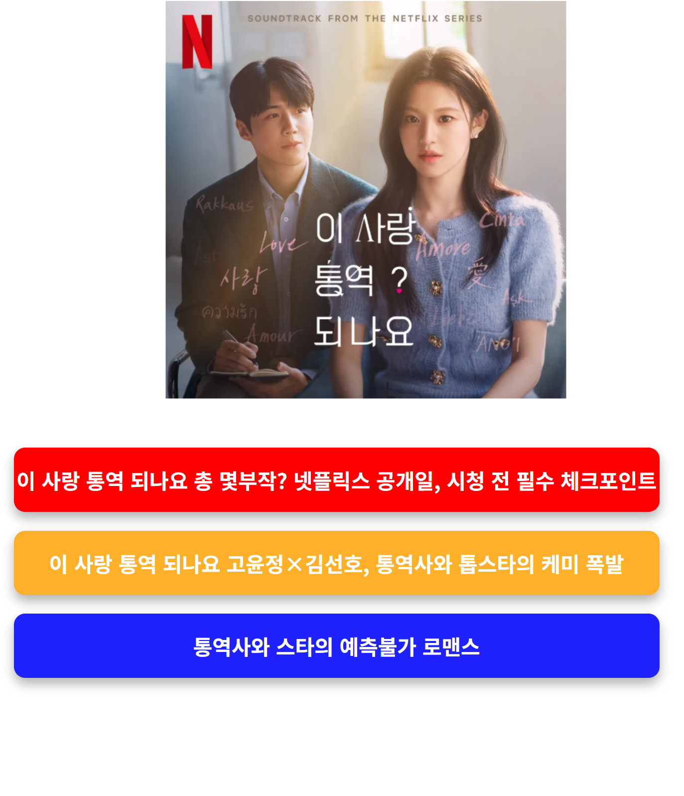 | 이 사랑 통역 되나요 | 언어, 감정, 오해 | 현실적 감정 성장 | 공감형 로맨스, 케미 중심 |