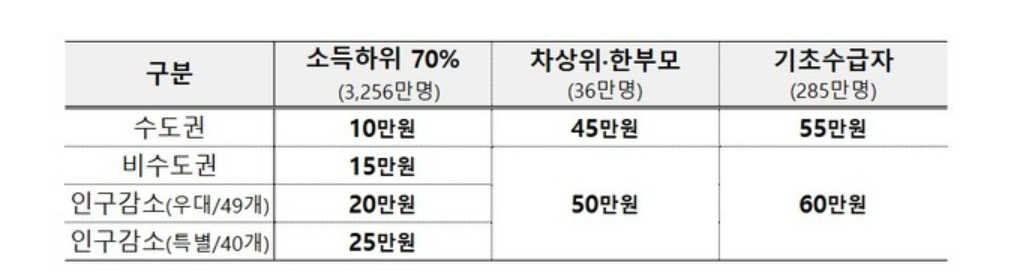 이번 지원금 정책에서 가장 많은 금액을 받는 계층이 바로 기초수급자와 차상위 계층입니다. 일반 소득 하위 70%와 비교하면 최소 3배 이상의 금액 차이가 발생합니다.